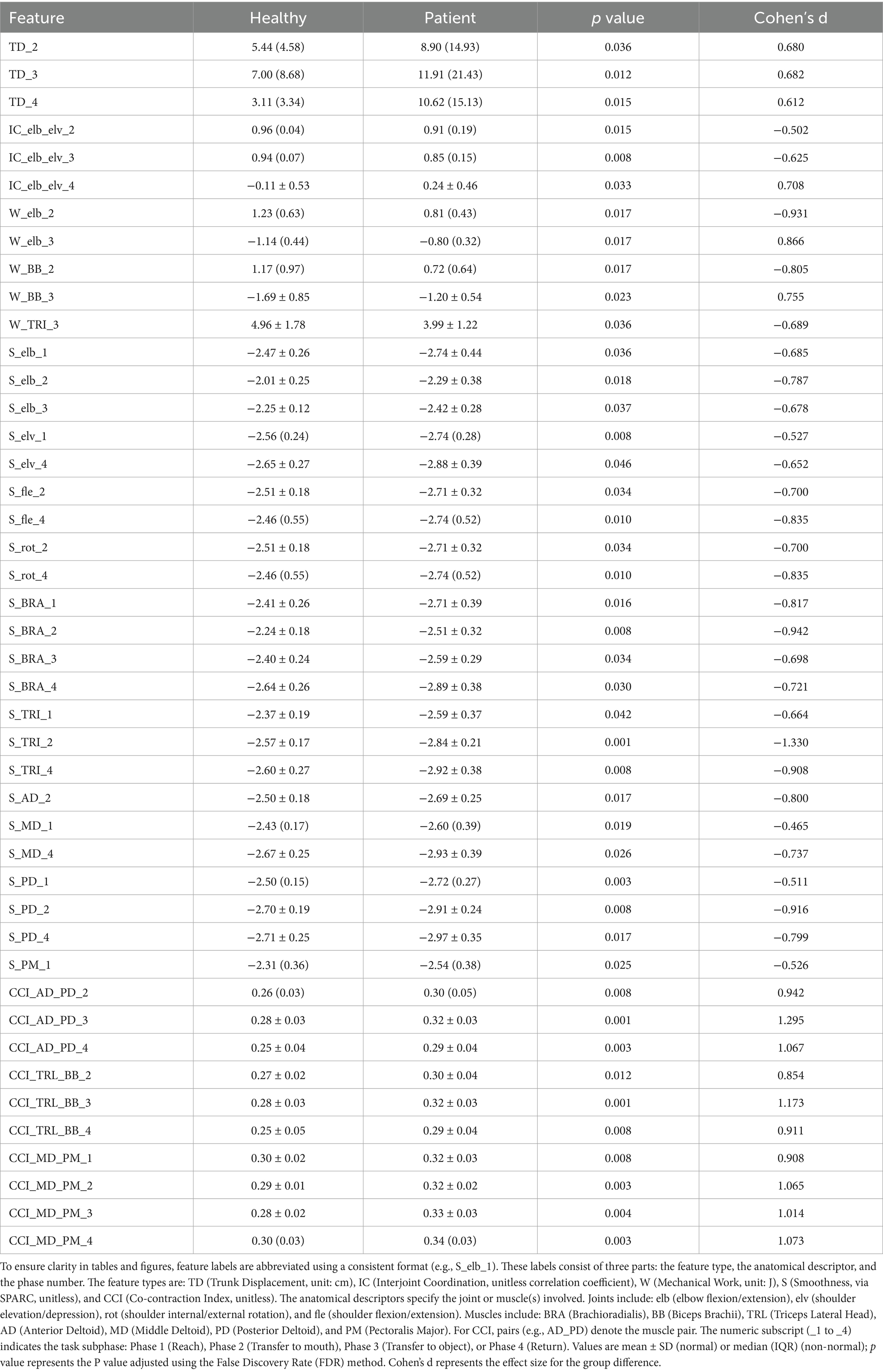 The average value of the middle three trials for each participant was used for statistical analysis. Feature data were first tested for normality. For normally distributed features, independent samples t-tests were used to compare differences between the healthy and stroke groups. For non-normally distributed features, the Mann–Whitney U test was used. Descriptive statistics: normally distributed features are reported as mean ± standard deviation; non-normally distributed features are reported as median (interquartile range, IQR). All feature labels and abbreviations (e.g., TD_2, S_elb_1) used in this study are defined in the note of Table 1. To account for multiple comparisons, all p values were adjusted using the Benjamini-Hochberg False Discovery Rate (FDR) procedure. Statistical significance was set at an FDR-adjusted p < 0.05. To quantify the magnitude of group differences, effect sizes were calculated using Cohen’s d. Statistical analyses were performed using SPSS 24.0 (IBM, United States).
