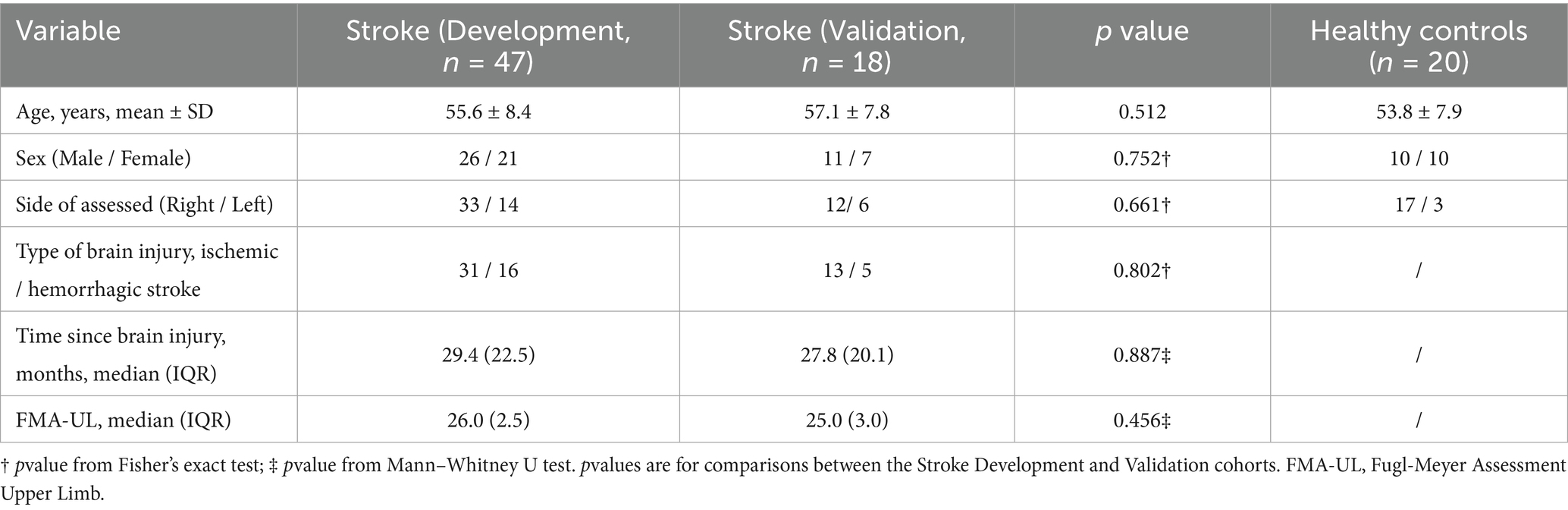 A total of 65 stroke patients and 20 healthy controls were included in this study. The stroke patients were divided into a model development cohort (n = 47) and an independent test cohort (n = 18). As summarized in Table 2, there were no significant differences in demographic or key clinical characteristics, including age, sex, assessed side, type of brain injury, time since injury, and baseline FMA-UL scores, between the two cohorts (all p > 0.05).