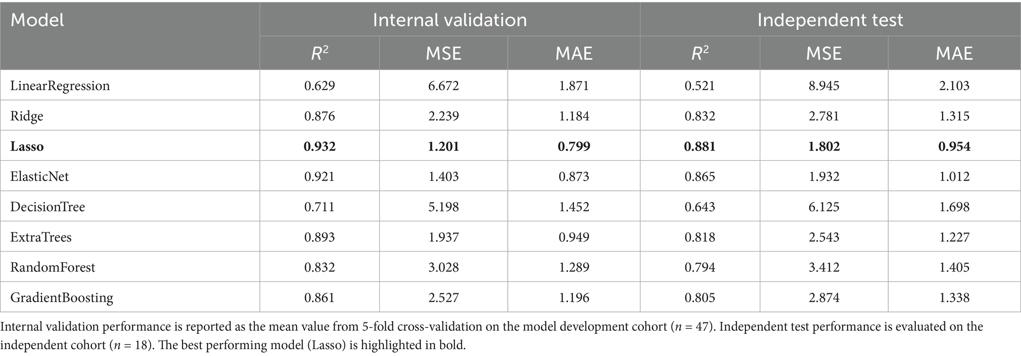 Based on the internal validation results, the best-performing algorithm (Lasso Regression), which also offered the best balance of predictive accuracy and model interpretability, was identified. Subsequently, a final model of this algorithm was refit using the entire derivation cohort (n = 47), with its hyperparameters fixed to the optimal values identified during the cross-validation. Finally, this trained model was evaluated on the completely independent test cohort (n = 18). The R2, MSE, and MAE calculated on this dataset are reported as the model’s independent test performance, providing an unbiased assessment of its generalizability to new patient data.