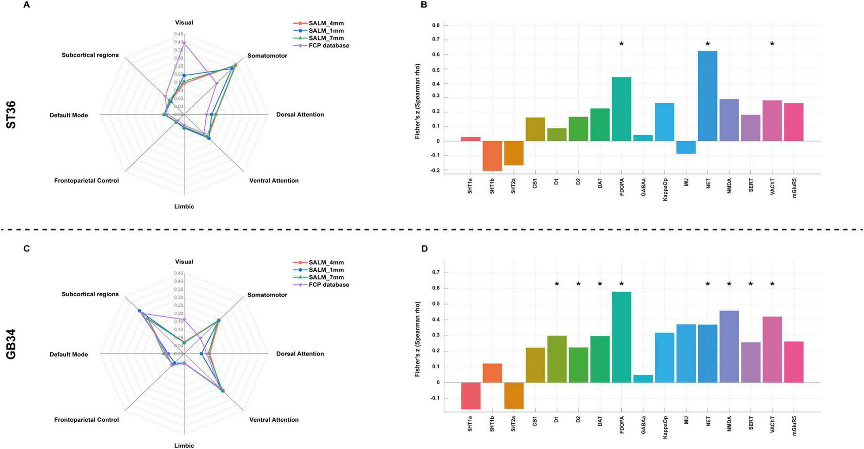 Based on the FCNM maps of ST36 and GB34, the JuSpace toolbox (computing option 3) and the default Neuromorphometrics Atlas comprising 119 regions were employed to assess spatial correspondence with selected neurotransmitter receptor/transporter maps. Specifically, Fisher’z-transformed Spearman correlation coefficients were computed between each FCNM map and the spatial distributions of the respective receptors or transporters. To account for spatial autocorrelation, a gray matter probability map was incorporated as a covariate. Statistical significance of the correlation coefficients was evaluated using one-sample t-tests against zero, with exact P-values derived from 10,000 permutations. Multiple comparisons were controlled by applying FDR correction at a threshold of P < 0.05.