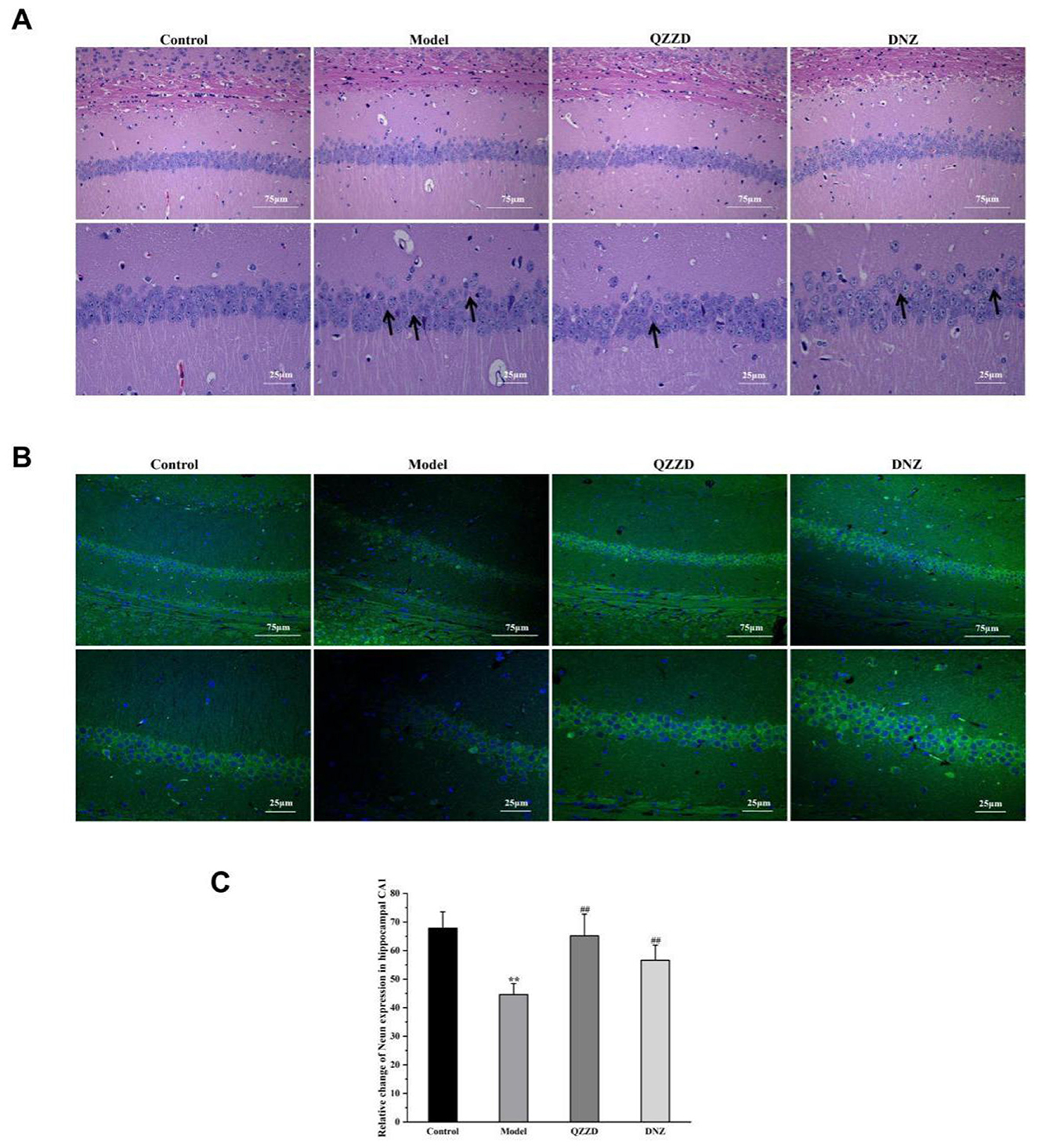 Figure 10. Effects of QZZD on neuronal death. (A) CA1 region of the hippocampus after HE staining [Scale bar: 75 and 25 μm (insert), n = 6]. (B) CA1 region of the hippocampus after NeuN staining [Scale bar: 75 and 25 μm (insert)]. (C) Number of NeuN-positive cells in CA1 region of the hippocampus. Values were expressed as means ± SD, n = 6 in each group. **p < 0.01, compared with the control group; ##p < 0.01, compared with the model group.