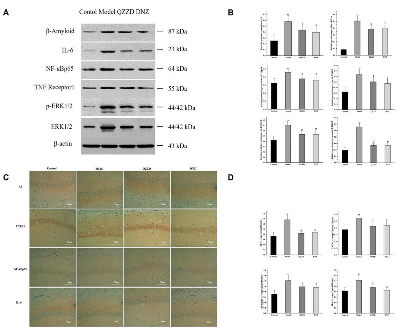 Figure 11. Effects of QZZD on expressions of Aβ, IL-6, NF-κBp65, TNFR1, p-ERK1/2 and ERK1/2 in hippocampal tissues of APP/PS1 double transgenic mice with dementia. (A) Western blotting analysis showing the protein expression levels of Aβ, IL-6, NF-κBp65, TNFR1, p-ERK1/2 and ERK1/2 in the hippocampus. (B) Quantitative analysis of Aβ, IL-6, NF-κBp65, TNFR1, p-ERK1/2, and ERK1/2 protein bands. Values are expressed as the mean ± SD, n = 6 in each group. **p < 0.01, compared with the control group; #p < 0.05, ##p < 0.01, compared with the model group. (C) Immunohistochemistry analysis showing the protein expression levels of Aβ, TNFR1, NF-κBp65, and IL-6 in the hippocampus. (D) The average optical density of Aβ, TNFR1, NF-κBp65 and IL-6 in the hippocampus. Values are expressed as the mean ± SD, n = 6 for each group. **p < 0.01, compared with the control group; #p < 0.05, ##p < 0.01, compared with the model group.