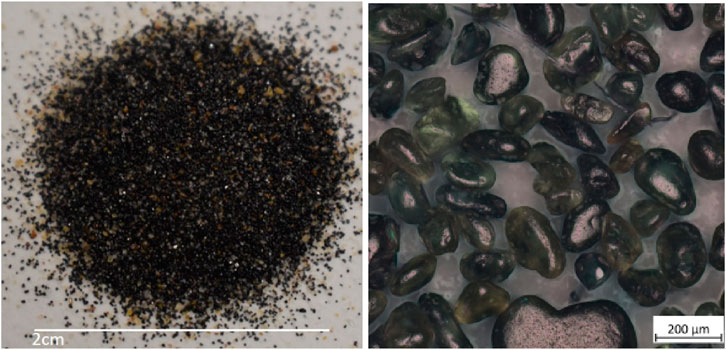 Under the optical microscope the monazite sand was black/brown to pale yellow in colour, showing a vitreous sheen. The sand grains were well rounded, well sorted and, despite colour differences, were determined to have very similar elemental makeup across and within the grains. This was semi-quantitatively confirmed by SEM-EDX in the initial nondestructive assay and by XRF (Figures 1–3). No biological contamination of the sample was found in any of the analyses. For these reasons, we believe that this monazite sand was pre-sorted by sieving (due to consistent grain sizes), washing and magnetic separation (ascertained by testing with a strong magnetic field) before it was sent to the UK from India and archived. The grains show signs of mechanical abrasion but no signs of chemical pitting from any in situ leaching. The material is readily digested when exposed to strong acids or alkalis. The monazite quickly breaks down and becomes translucent, taking on a pale yellow-to-white appearance, but does not dissolve entirely without both an alkali and acid step as would be expected from monazite ore dissolution procedures detailed above.