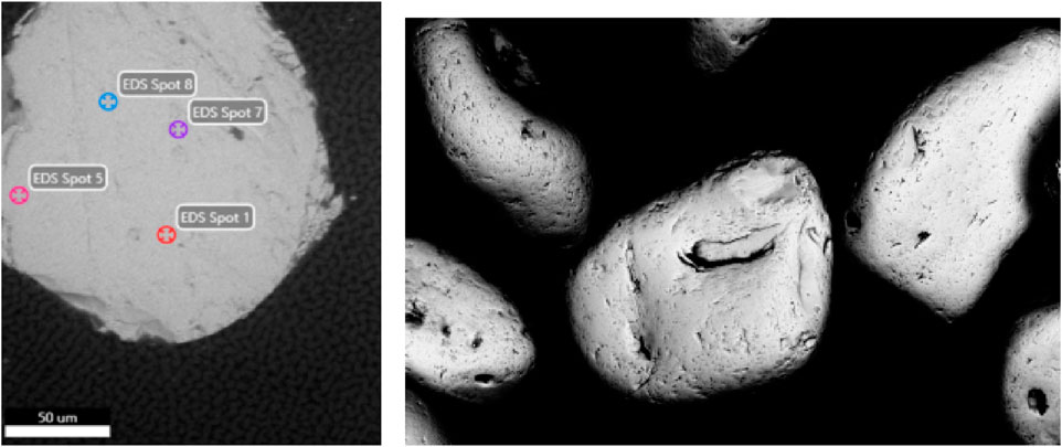 Figure 2. Electron micrograph of representative polished monazite sand grains, showing EDS spot locations (left) and Monazite sand grains, ×662 magnification, under Backscatted Electron (BSE). Using BSE imaging mode enables a sample to be quickly visually assessed to see if there is substantial Z-number variation across a mass of sample material.