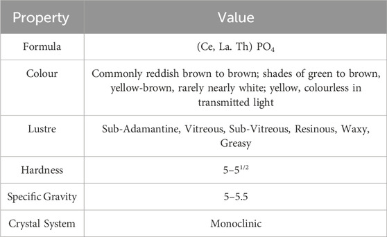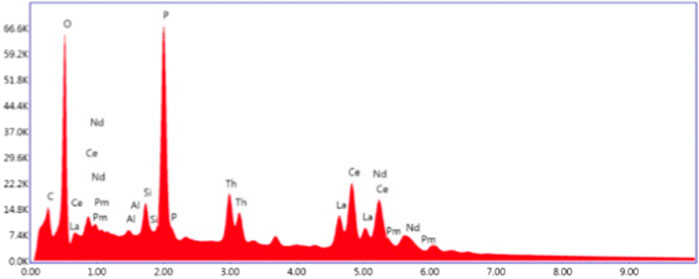 The measured thorium content was 6.1 weight percent (wt%) of the precursor monazite sand (using XRF). The properties of the sample (Table 2) and the information provided by the BGS suggests that it has already undergone some mechanical processing and mineral separation and that it was a high-grade ore.