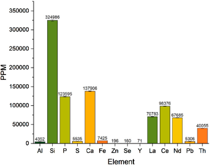 The reaction slurry was then filtered at 65°C and the solid product retained. The product of this process is an insoluble residue (including Th). This stage was not designed to dissolve any of the thorium but instead, produce a fine “silica slurry”; most of the initial phosphate is dissolved and removed during the filtering of this stage and is not measured in high concentrations in the arising solid residues. The analysis of the insoluble residue material agreed well with predicted material measurable propetries. The material was measured by High Resolution Gamma Spectrometry (HRGS) and was still confirmed to contain U and Th (U/Th = 0.75). The radioactive decay series is perturbed from secular equilibrium and Ac, Pb, Ra, Tl, Pb and Bi were readily detectable by HRGS indicating the carry-through of many of the decay daughter isotopes into the residue. Subsamples of the material were processed for analysis and the 228Ra/232Th model age was calculated as 0.32 years (U = 10% k = 2, reference date: 26/10/2022) in agreement with the known timeline of materials processing within a year. The material was shown to contain the same ratios of REE as the precursor monazite (Figure 5), with 1–100 ppm La-Eu in the measured diluent solutions. The REE/chrondite normalised data is quite specific as the ratios remain consistent (preserved) and the absence of the heavier REE is different in other ore materials reported (Tay et al., 2020). The Th assay was determined to be 47±5% by alpha spectrometry and Inductively Coupled Plasma–Optical Emission Spectroscopy (ICP-OES). Notable impurities in the solution by ICP-OES were Al (580 ppm), Fe (10 ppm) and Si (200 ppm). Elements Eu, Tb, Cr, Cu, Ti, Ni, Mg, Ba, Ca, Ba, Sn and other trace impurities screened via semi-quantitative analysis were all determined to be at concetrations below the detection limit of the analytical techniques employed.