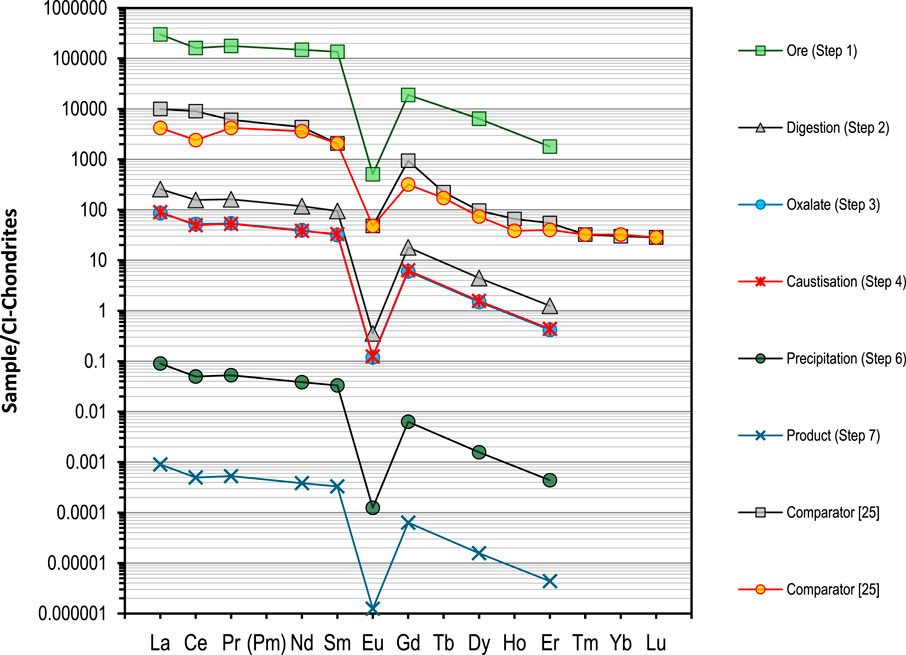 The isotopic and trace elemental analysis of the dissolved material, including the analysis of REE is consistent with those reported from southern India (Anitha et al., 2020; Veerasamy et al., 2021). The quantities of these lanthanides and absence of the heavy lanthanides is a differentiator to other ores reported. The results were normalized as described elsewhere and compared as part of the process stages detailed above from ore to oxide (Figure 5) (Nakamura, 1974). The abundance and relative concentrations of the light rare earth elements (La-Sm) were determined to be consistent with reported materials, with detection limits (sub-ppm) measured for the REE from Eu-Lu with the exception of Gd, Dy and Er. The isotopic actinide composition of the material was determined to be consistent with natural uranium and thorium (determined by gamma spectrometry and mass spectrometry against isotopic standards for uranium) (Higginson et al., 2021). This isotopic signature remained consistent throughout purification of the material to an oxide using mass spectrometry so further discussion on this is not included, but this would be indicative of an early fuel cycle material prior to irradiation and could be investigated further in future work utilizing high precision isotope mass spectrometry.
