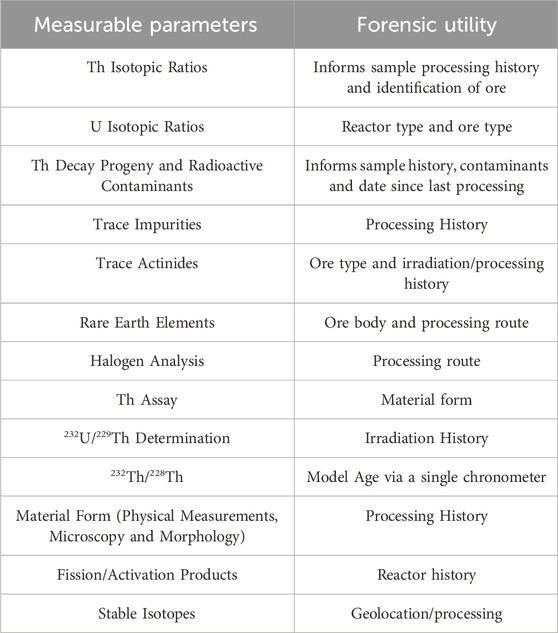 It is important to initially review the potential nuclear forensic signatures in thorium materials and the analytical methods available in standard laboratories to be applied. There are reported methods for the analytical radiochemistry and analysis of thorium-containing materials that can be applied for nuclear forensics and fuel development purposes (Shen et al., 2002; Hyde, 1959; Kayzar-Boggs et al., 2021). There is also academic measurement interest, for example, in earth and planetary sciences (Allègre et al., 1986). There are several relevant thorium isotopic and assay reference materials that can be used to underpin measurement traceability to validate analytical methods and ensure defensibility of results (Holmes, 2001; Essex et al., 2018). Studies on the impact of isotopic signatures in thorium/uranium mixed fuels are a recent highlight to understand post irradiation signatures of interest compared to standard nuclear forensic approaches (Evitts et al., 2021). Recent work has also explored the radio-chronometric analysis of thorium decay systems for age dating of processed nuclear materials within decades of the last date of purification or irradiation (Kayzar-Boggs et al., 2021).