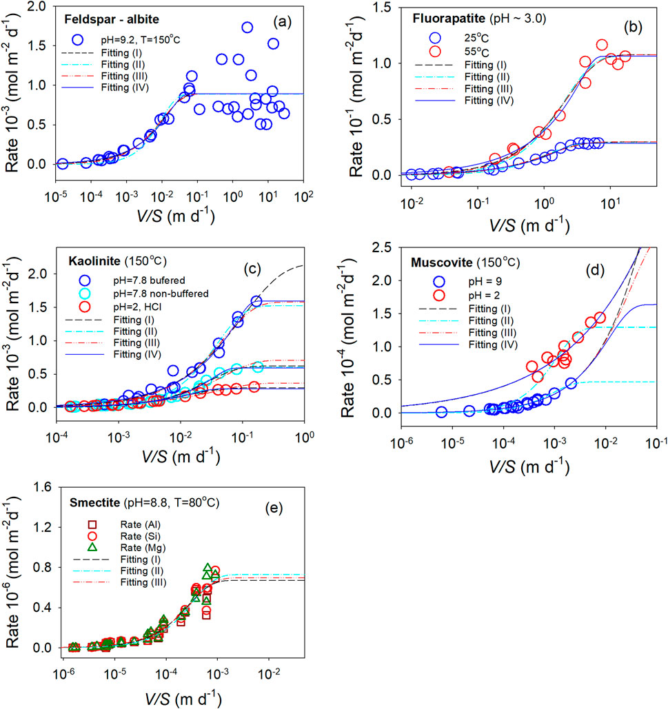Figure 2. Dissolution rate as a function of V/S ratio. (a) Feldspar, (b) Fluorapatite, (c) Kaolinite, (d) Muscovite, and (e) Smectite. Symbols are experimental data. Lines are fitting results: dashed-lines (black, fitting (I) with m = 1), dashed-dot-lines (light blue, fitting (II) with m = 1 and q = 1, dashed-dot-dot-lines (red, fitting (III) with q = 1, solid-lines (blue, fitting (IV) without constraints.