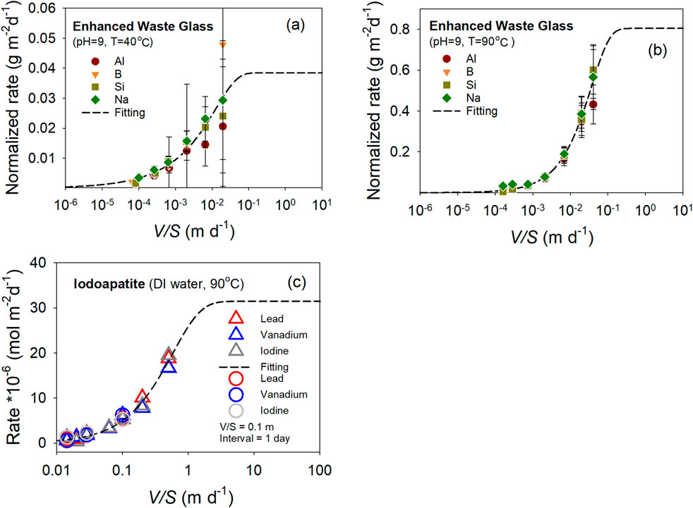 Figure 4. Dissolution rate as a function of V/S ratio for Enhanced Waste Glass at pH = 9 °C and 40 °C (a) and 90 °C (b), and iodoapatite with DI water at 90 °C (c). A Cauchy weighting function was used to account for an increase of errors as