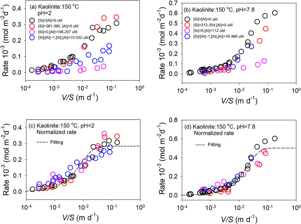 Figure 5. The dissolution rate of kaolinite at 150 °C as a function of solution V/S and solution composition at pH = 2 (a) and pH = 7.8 (b). The normalized rates are plotted as a function of V/S for pH = 2 (c) and pH = 7.8 (d). The dashed lines are fitting results.