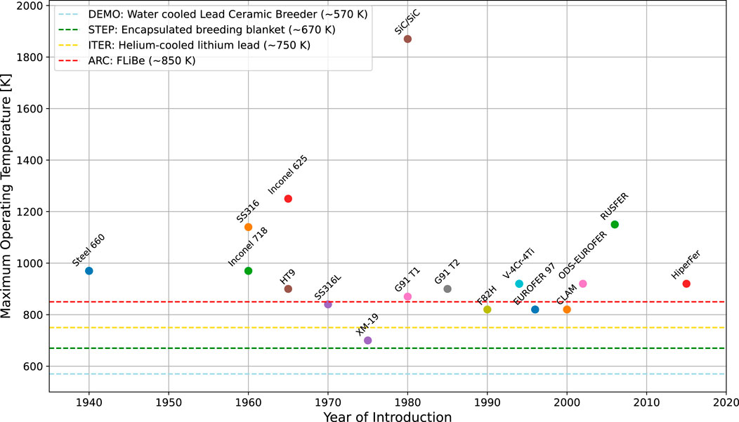 The differentiated adoption of structural materials across the various blanket concepts reflects not only constraints related to compatibility and activation, but also the specific thermal operating conditions characteristic of each reactor. Figure 1 provides a concise and comparative overview of the main materials developed for nuclear applications, indicating for each material its maximum operating temperature and the year when the development of that material has started.