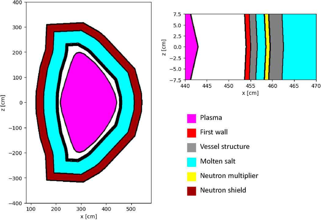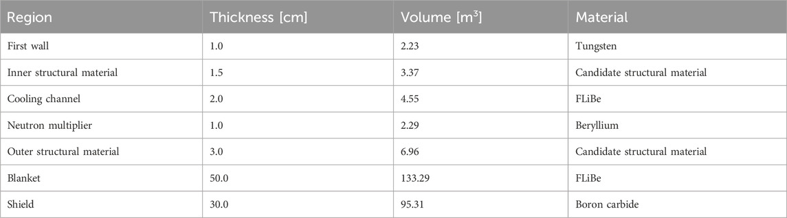 The simulation domain is composed of a series of discrete layers, each representing a functional region of the machine, such as plasma-facing components, tritium breeder zones, structural materials, and shielding, using an ARC-like configuration as baseline. The layered geometry approximates the radial structure of an actual ARC-like design while maintaining geometric simplicity.