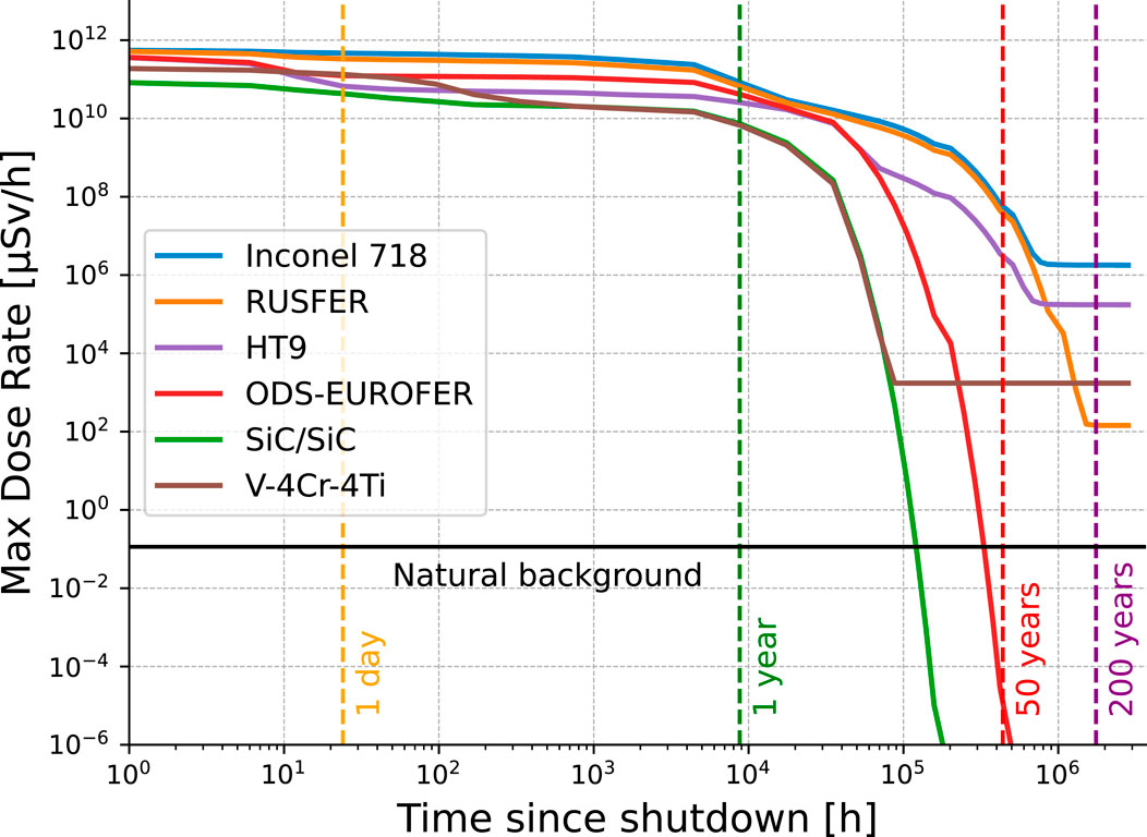 In addition, OpenMC includes a built-in capability for performing shutdown dose rate calculations via the direct 1-step (D1S) method (Valenza et al., 2001; Eade et al., 2022). This approach replaces prompt photon emission with photons originating from the radioactive decay of nuclides produced during irradiation, enabling an efficient estimation of post-shutdown gamma fields. The same coupled neutron–photon transport framework is used, making the method particularly suitable for integration with the current model setup. Using this method, the most impactful transmutation products generated in each structural material are identified, and the time evolution of the shutdown dose rate is evaluated following 1 year of full-power irradiation. This analysis enables a comparative assessment of the radiological hazard posed by each material in the post-shutdown phase, providing insight into waste classification requirements.