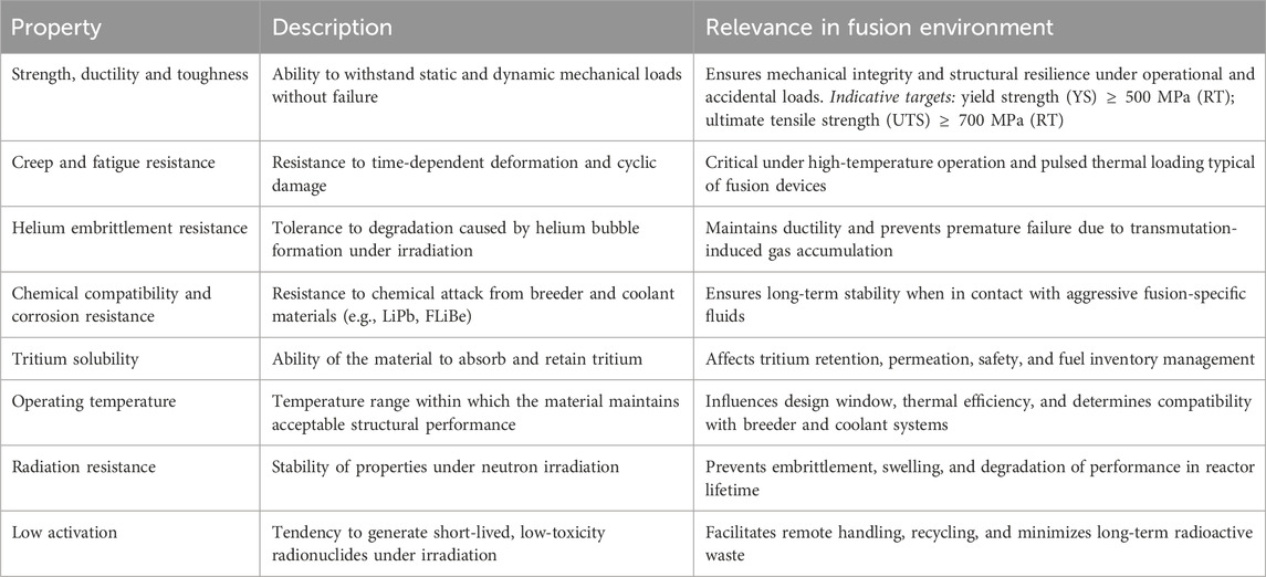 To address the extreme operational conditions outlined above, structural materials must satisfy a number of interdependent functional requirements. Table 1 provides a summary of the key properties that guide material selection for vacuum vessel applications, highlighting their physical meaning and importance in the context of fusion technology.