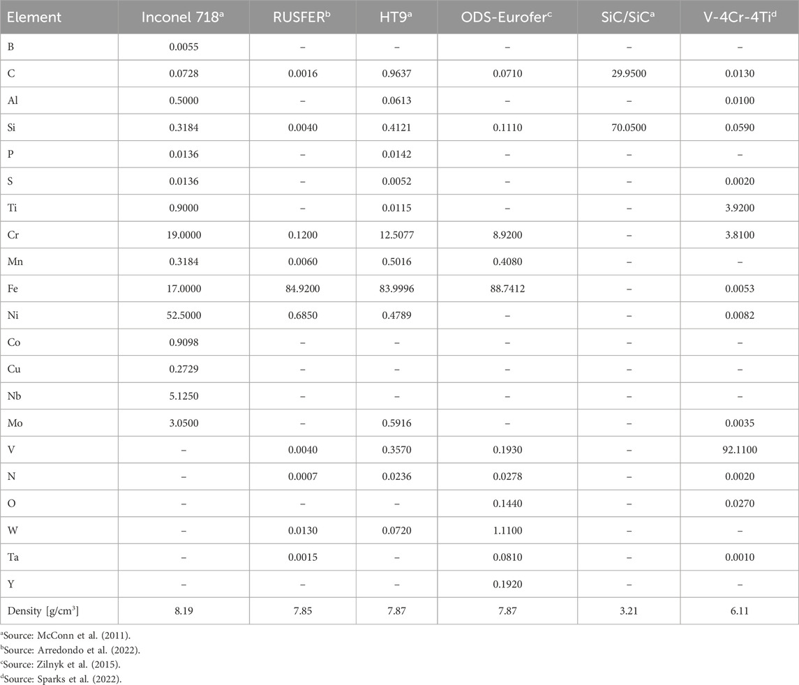 Six structural materials were selected for detailed analysis, each representative of one of the main families discussed in the previous sections and chosen based on their maximum operating temperature, which is compatible with the high-temperature environment of an ARC-like fusion reactor. Inconel 718 was chosen as a well-known high-performance alloy with proven mechanical strength and corrosion resistance at elevated temperatures (Sorbom et al., 2015). For the class of Reduced Activation Ferritic/Martensitic (RAFM) steels, the Russian-developed RUSFER (EK-181) was selected due to its advanced development status and relevance within DEMO-oriented studies (Bachurina et al., 2018). As a representative of high-strength martensitic steels, HT9 was included owing to its widespread use in fast reactors and its robustness under neutron irradiation (Chen, 2013). For the oxide dispersion strengthened (ODS) steels, ODS-EUROFER was selected due to its enhanced creep strength and radiation resistance (Zilnyk et al., 2015). The SiC/SiC composite was considered in its standard nuclear-grade formulation, offering superior high-temperature and low-activation properties (Koyanagi et al., 2018). Finally, for the family of vanadium-based alloys, the well-characterized V–4Cr–4Ti was selected, thanks to its low neutron activation, good compatibility with liquid breeders, and promising performance under high heat fluxes (Smith et al., 1985a).