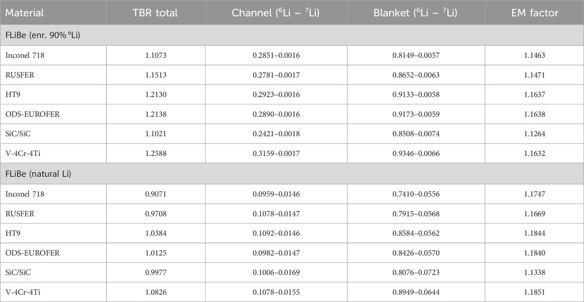 Table 4. Summary of tritium breeding performance and energy multiplication for different structural materials, including isotopic contributions from 6Li and 7Li.