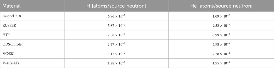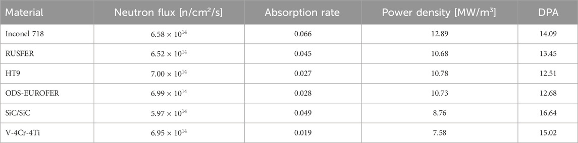 The developed model allows for a systematic comparison of structural materials based on their DPA values, activation behavior, and neutronic indicators including TBR, EM, power deposition and light gases growth. The chemical compositions of all tested materials, summarized in Table 3, are taken from the literature (McConn et al., 2011; Sparks et al., 2022; Zilnyk et al., 2015; Arredondo et al., 2022).