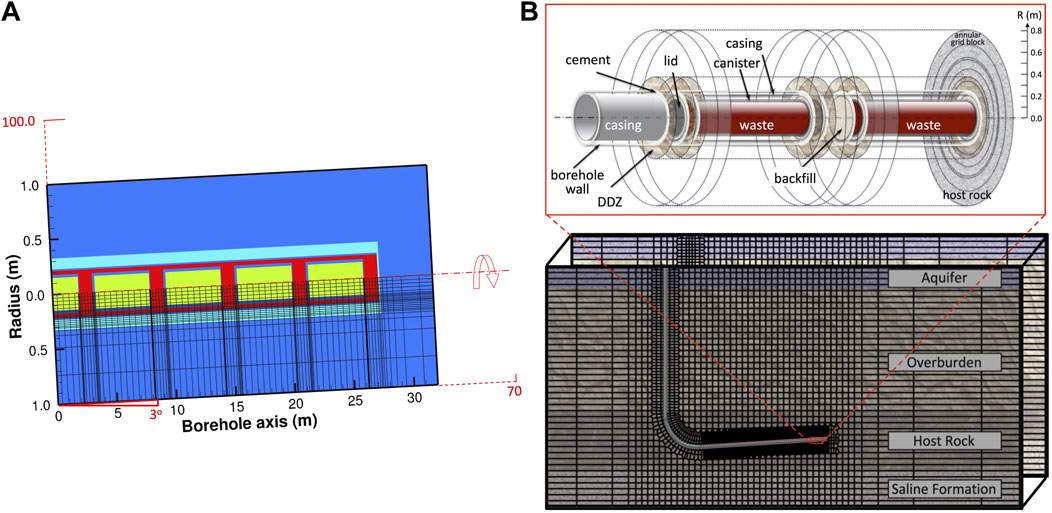 Figure 1. (A) Two-dimensional, radial (2-DR) discretization of local model; (B) 2-DR near-field model embedded in 3-D repository-scale model.