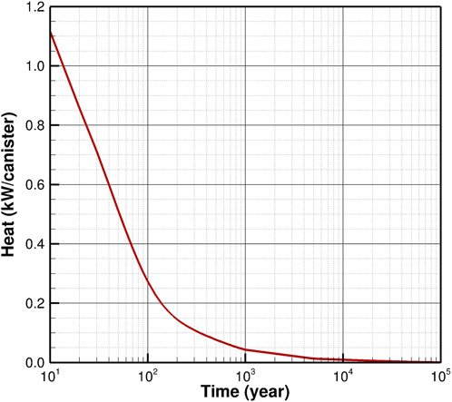 The decaying waste also generates heat. Each canister is assumed to house the fuel rods from an assembly of a Westinghouse AP1000 pressurized water reactor after 10 years of cooling in a spent fuel pool. (To dispose of the entire AP1000 assembly rather than just the fuel rods, a slightly longer canister would need to be fabricated, reducing the overall heat output per borehole length.) The assemblies are assumed to have around 4.0% enrichment and a burn-up of 55 GWd/t. Each assembly contains 0.5465 tons of heavy metals, which results in an initial heat release at the time of waste emplacement (after the 10-year cooling period) of 1.12 kW per canister (Gibb et al., 2008). The reduction in heat released by each canister, shown in Figure 2, is supplied as a time-dependent, volume-specific source term to all computational elements of the numerical model that represent a canister.