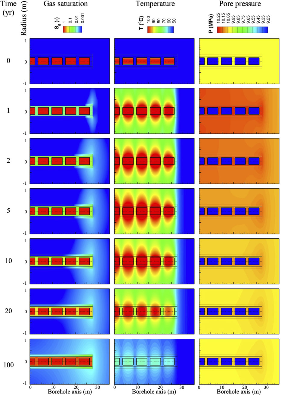 Simulated datasets show changes over time in gas saturation, temperature, and pore pressure around a borehole. Each column represents a different parameter with time intervals of 0, 1, 2, 5, 10, 20, and 100 years. Color gradients indicate variations, with gas saturation and temperature decreasing while pore pressure largely remains constant.