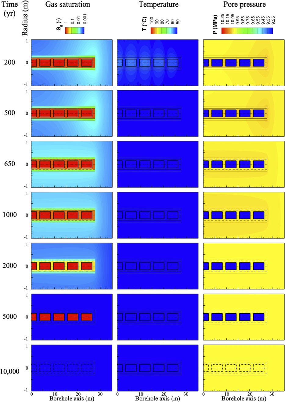 Simulation graphs display changes over time across three categories: gas saturation, temperature, and pore pressure within a borehole. Each row represents different time points from two hundred to ten thousand years. Gas saturation varies from high to low, using a color gradient from red to blue. Temperature is mainly shown in blue, indicating lower ranges. Pore pressure spans yellow to blue, reflecting varying pressure levels. The graph provides insights into the spatial and temporal evolution of these parameters.