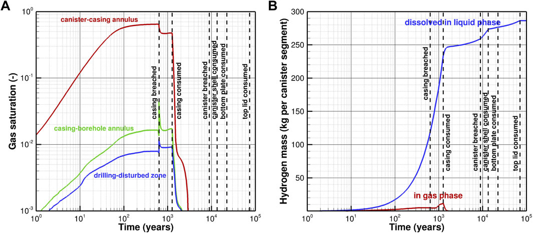 Panel A shows a graph of gas saturation versus time in a log scale, with three lines representing different zones: canister-casing annulus (red), casing-borehole annulus (green), and drilling-disturbed zone (blue). Key events like casing breached and consumed are marked. Panel B displays hydrogen mass versus time, with lines for hydrogen dissolved in the liquid phase (blue) and in the gas phase (red). Similar key events are noted. Both charts are plotted on a log-log scale.