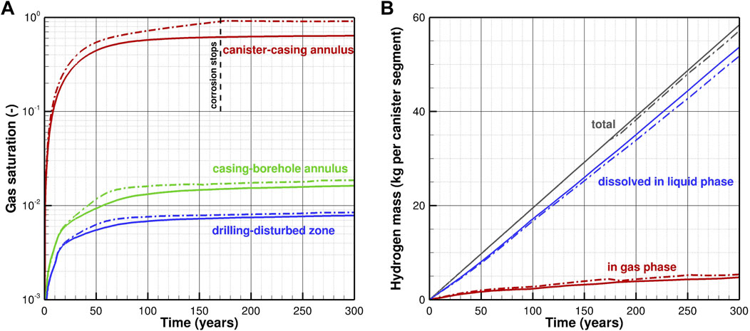 Figure 6 shows the impact of water consumption and saturation-dependent reduction in corrosion rate on average saturations and hydrogen accumulation for the first 300 years after waste emplacement. Despite the reduced corrosion rate, the gas saturation in the canister-casing annulus is higher as a result of water consumption. Corrosion stops altogether once the gas saturation reaches 90%. Nevertheless, the casing will eventually be breached as corrosion of its outer surface continues, with water supplied from the host rock. Figure 6B confirms that the total amount of hydrogen being generated in the first 300 years is slightly reduced due to the saturation-dependent reduction in corrosion rate, and that a larger amount of hydrogen is present in the gas phase near the corroding surfaces, with correspondingly less hydrogen dissolved in the liquid phase, which also reflects the reduced fluid pressure caused by water consumption. As the density of the corrosion product is lower compared to the steel, the volume increases and correspondingly the porosity is reduced; this effect is not accounted for in these simulations. However, the overall effect is minor, except for the delay of the casing breach time. For the remaining simulations using the repository-scale model, we ignore water consumption and saturation-dependent corrosion-rate reduction and assume that gas generation proceeds at the higher, initial rate until the metal components in the EBS are fully consumed.
