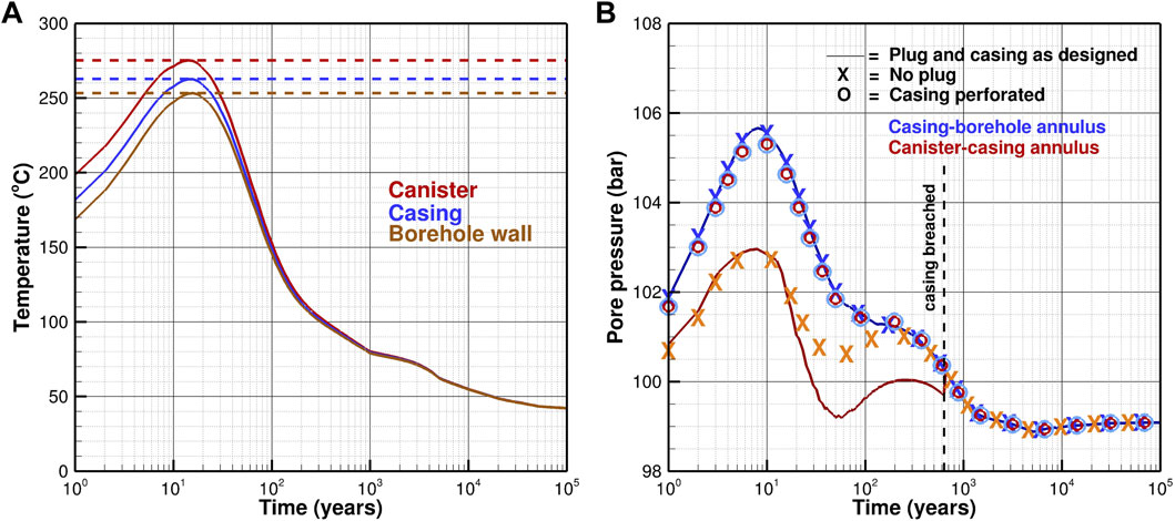 In general, the modeling revealed that the evolution of temperatures, pressures, and gas saturations are locally confined, occur over different temporal scales, and are marked by discrete events such as the breaching and consumption of the casing and canisters. The open space between the canisters and the casing, which is initially completely filled with a drilling or emplacement fluid, is confined by the impermeable casing, limiting fluid flow to occur in an axial direction towards the end of the casing, where gas and liquid backflow along the cemented outer annulus, and to a lesser extent towards the low-permeability plug, which restricts, but does not prevent, some fluid losses into the vertical access hole. Unlike gas, heat readily dissipates radially into the near field geosphere. This geometrical configuration is drastically changed once the casing is breached, allowing for pressure equilibration between the inner and outer annuli, and enabling fluid flow in both radial and axial directions.