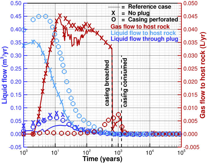 If the casing is assumed perforated or otherwise breached immediately after waste emplacement (circles), the liquid initially present in the open space between the canister and the casing is directly displaced into the host rock. This radial liquid release leads to slightly smaller axial flow and less water penetrating the plug. Gas generated by casing corrosion now preferentially enters the open space between the canisters and the casing rather than overcoming the gas entry pressures at the interfaces between the open space and the cement as well as the cement and the host rock. The onset of gas migration into the host rock is therefore delayed.