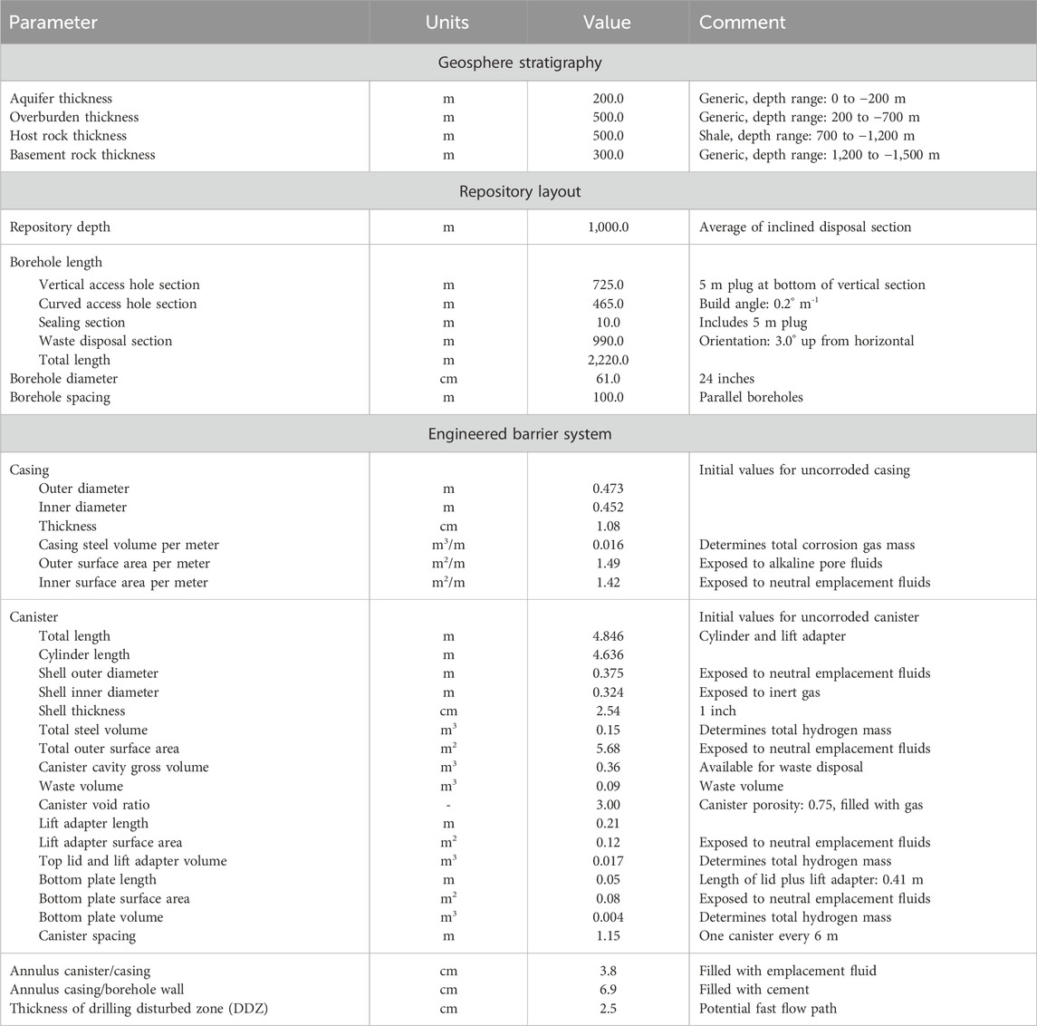 The geometrical parameters of each repository element represented in the model are summarized in Table 1. The surface areas and volumes of the canister and casing determine the gas generation rates and total amount of hydrogen being produced, as further discussed in Section 2.4. The canister spacing determines the average gas and heat generation rate per meter of borehole. We assume that one canister is emplaced every 6 m. If canisters were emplaced with a different spatial frequency f (canisters per meter), the average gas and heat generation rates would be changed by a factor of f/f0=f/1/6=6·f. Placing canisters without any spacing between them, which is not intended, would yield a maximum rate increase of 1.24. This increase is considered minor given the uncertainties in the reference rates and other parameters affecting fluid and heat flow in the near field of the repository. Nevertheless, minimizing canister spacing is certainly desirable for cost reasons, with the chosen spacing of approximately 1 m being considered reasonable and practical given potential operational and safety constraints.