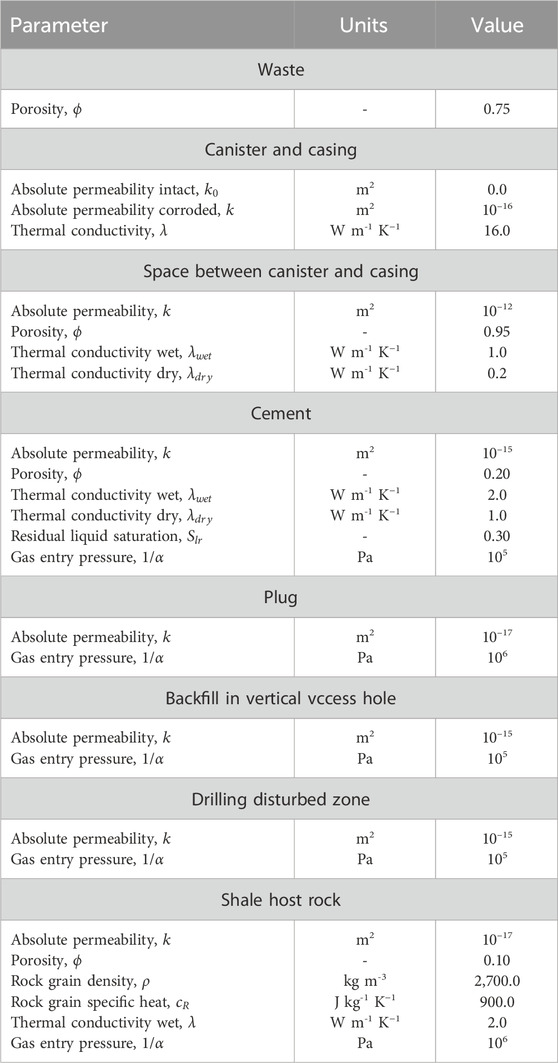 Properties of the main engineered and natural materials are listed in Table 2. For this generic analysis, typical values are selected for the host formation, specifically a relatively low permeability associated with a correspondingly high gas entry pressure. While each material is associated with a full set of thermal and hydrological parameters affecting two-phase flow of gas and liquid as well as conductive and convective heat transport, only a small subset of these parameters is provided, selected based on their significance for the storage and flow of fluids and heat within the respective material. The properties of the aquifer, overburden, and deep formation below the host rock have no significant impact on gas migration, which is controlled by the components of the EBS and near-field properties of the shale; these properties are therefore not listed or further discussed here. Note, however, that they affect the long-term migration of radionuclides, as discussed in Finsterle et al. (2020).