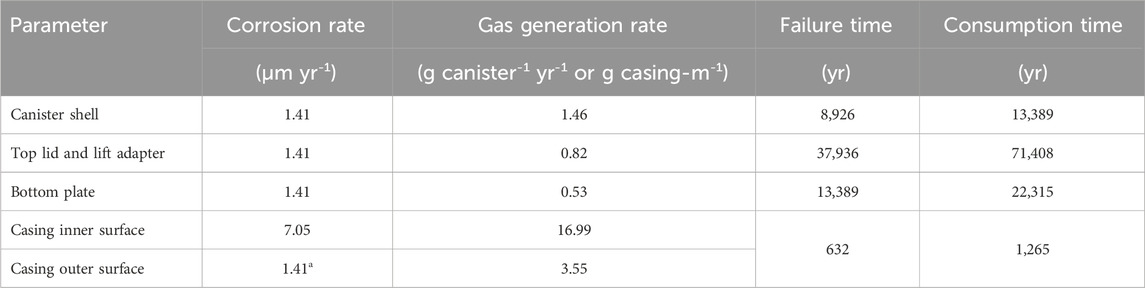 Table 3. Corrosion and gas generation rates, and times of failure and consumption.