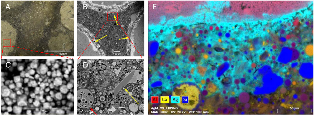 Figure 1. (A–D) Optical and scanning electron microscopy/backscattered electron images of microstructures in CS containing AgM granules. (A) AgM particles embedded in CS; (B) The yellow arrow points the AgM/CS interface; (C) Zoomed-in view of a AgM granule showing mesoscale pores and AgM polycrystalline grains; (D) Zoomed-in view of porous CS showing macroscale pores and FA and BFS particles; the red arrow points to a spherical FA particle while the dashed yellow arrow points to a BFS particle; and (E) elemental energy dispersive X-ray spectroscopy dot map near the interface between an AgM granule and CS shown in (D).
