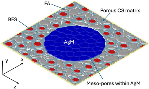 Figure 2. Schematic of the simulation cell, illustrating a AgM particle, FA inclusions, BFS particles, a porous CS matrix and meso-pores within the AgM particle. The AgM particle is represented as a cluster of smaller AgM grains. The volume fractions of AgM, FA, and BFS in the CS matrix are approximately 30%, 12.6%, and 23.8%, respectively. The mesopore volume within AgM is about 16% of the total volume of the AgM particle.