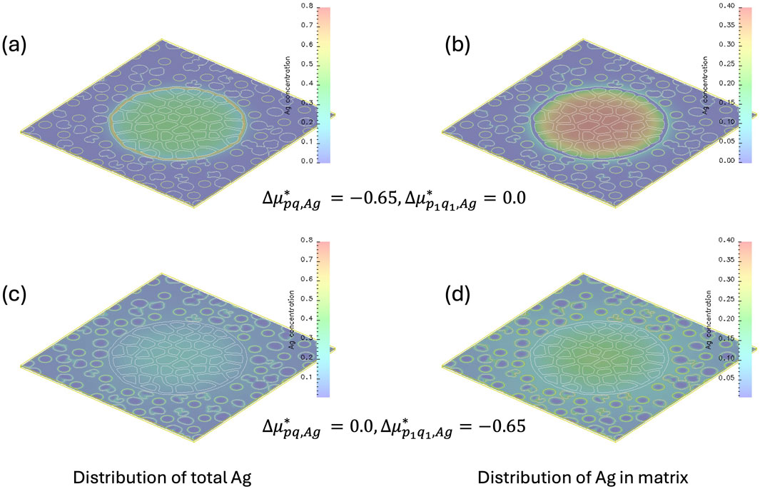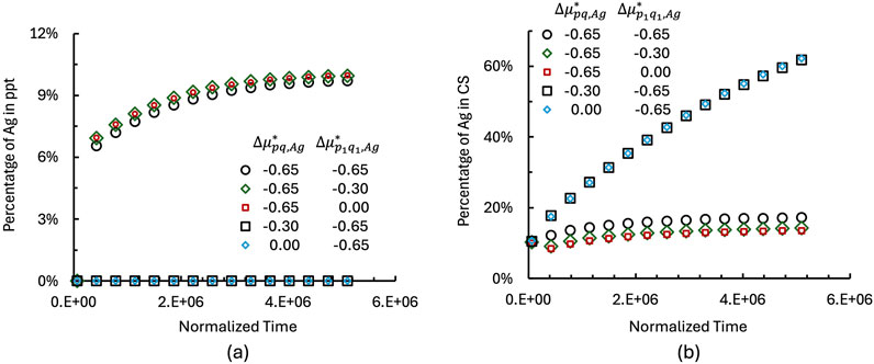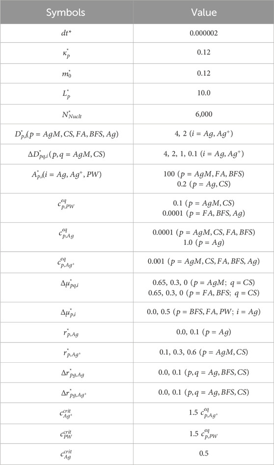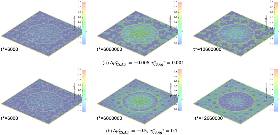 These results demonstrate that Ag distribution is highly sensitive to interfacial chemical potential conditions, as has been seen in experimental testing of AgM-CS sample compared with non-reducing formulation (Yamagata et al., 2022). The inhomogeneous chemical potential of Ag at the interfaces among AgM, BFS, FA, and CS leads to heterogeneous segregation and precipitation of Ag. This highlights the model’s ability to effectively capture the influence of interfacial chemical potential gradients on both the thermodynamic driving forces and kinetic processes governing Ag dissolution, segregation, and precipitation.