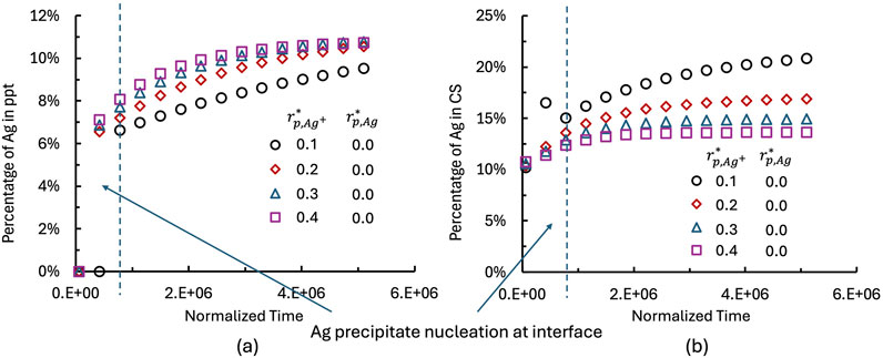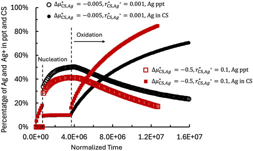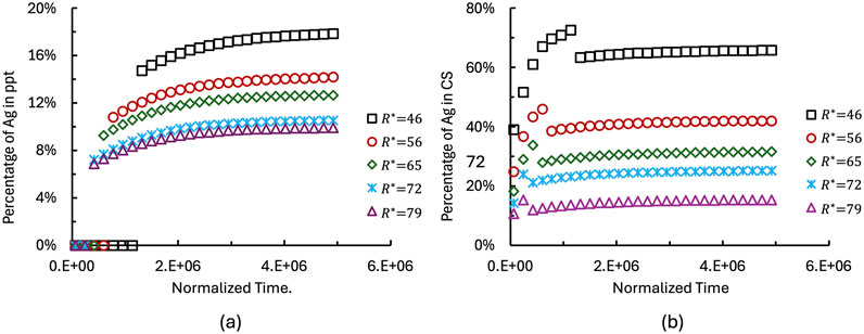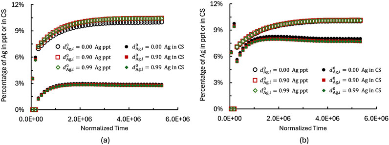 The sum of Ag in Ag precipitates and in CS represents the total dissolved Ag. For example, at a normalized time of 5,820,000, the amount of dissolved Ag reaches approximately 63% for the case where