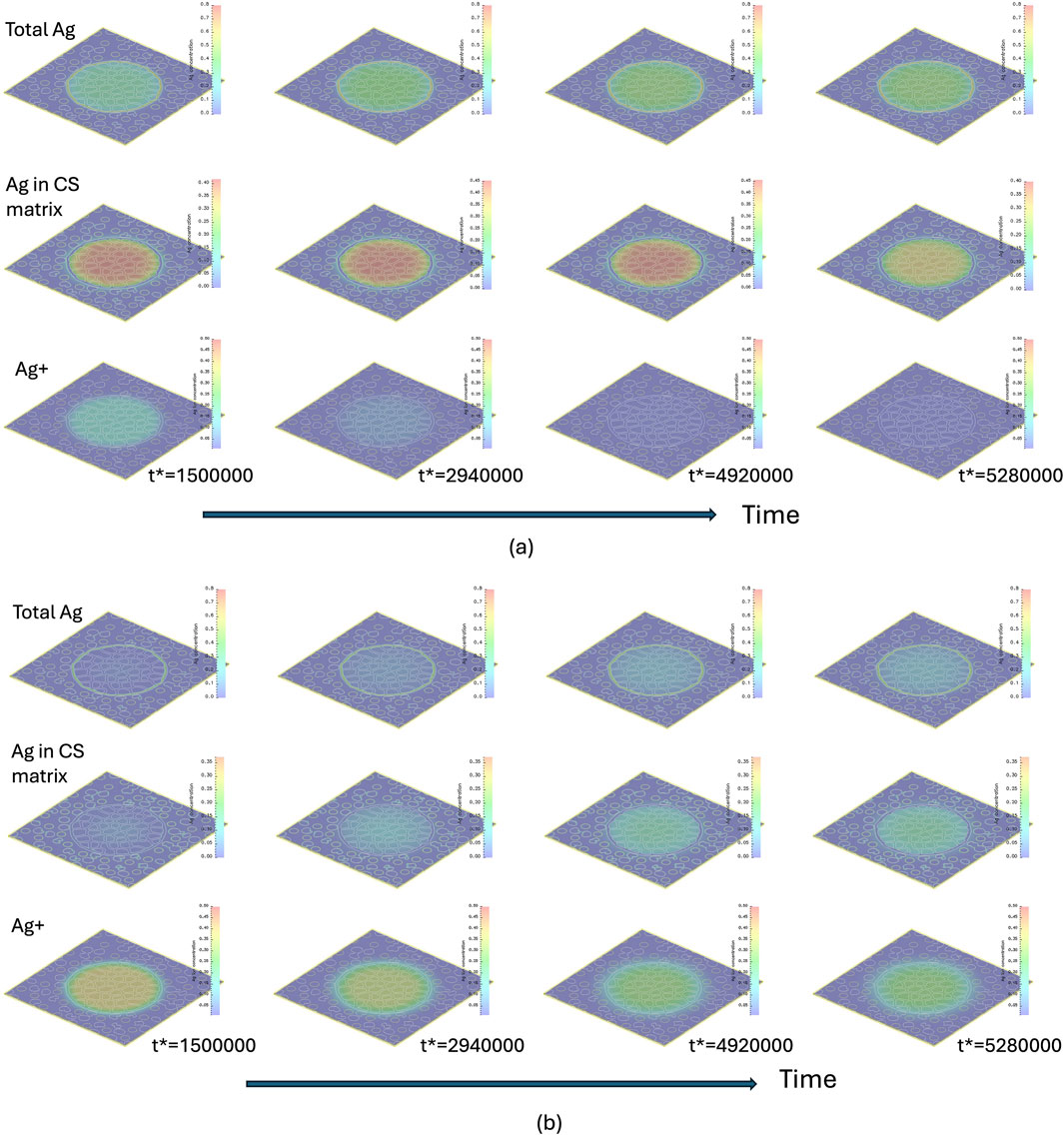 Figure 9. Temporal and spatial evolution of Ag concentration. (a)