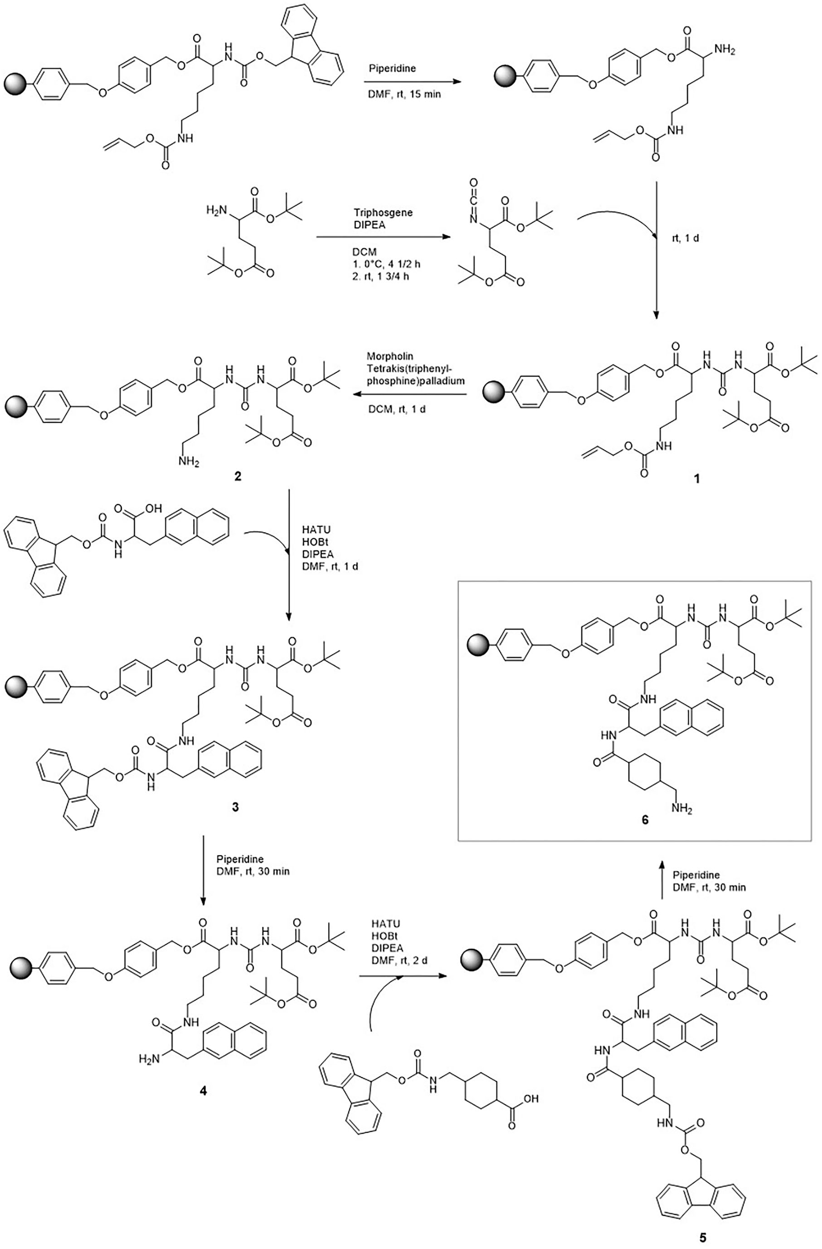 To remove the Fmoc-group from compound 5, it was stirred in a piperidine/DMF (1:1, 11 mL) solution for 10 min each and washed with DMF (10 mL) and dichloromethane (10 mL), leading to the final resin bound PSMA-617 backbone (6).