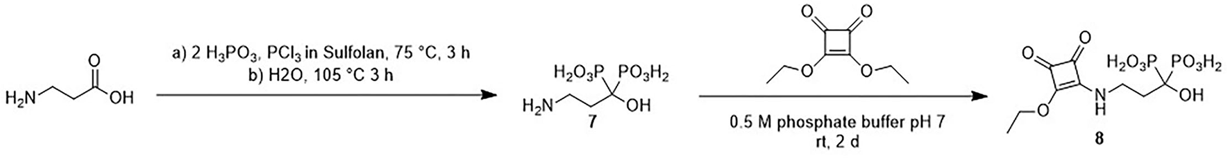Pamidronate (500 mg, 2.13 mmol) was dissolved in phosphate buffer (0.5 M, pH 7, 5 mL). 3,4-Diethoxycyclobut-3-ene-1,2-dione (squaric acid diethylester, SADE, 542 mg, 468 μL, 3.2 mmol) was added and the mixture was stirred for 2 days at room temperature. Ethanol (3mL) was added for crystallization. The mixture was allowed to stand for 3 days in the freezer to complete crystallization. The white precipitation was washed with cold ethanol and compound 8 (0.58 g, 1.62 mol, 76%) was obtained as white solid.