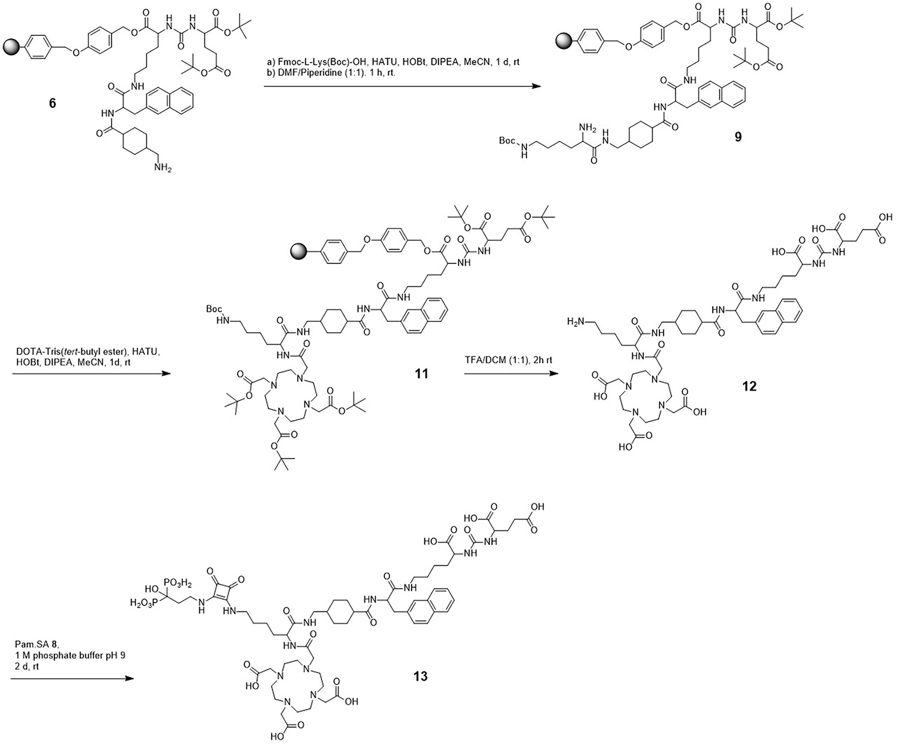 The final part of the synthesis was the conjugation of the two target vectors 6 and 8 and the DOTA-chelator using lysine as bridging unit (Figure 3). First, protected lysine was conjugated to the free amine of the resin bound compound 6. After Fmoc deprotection, DOTA-Tris(tert-butyl ester) was conjugated. Both steps were carried out with HATU as reagent for amide formation. This reaction led to the complete protected and resin bound compound 11. This compound was completely deprotected under acidic conditions and removed from the solid phase. In the further process of the reaction, protective groups are no longer necessary, as the following asymmetric amidation is highly selective for amines. Compound 12 was purified via semi preparative HPLC resulting in a yield of 4% after the amide formation steps. Finally, the second target vector Pam.SA (8) was added-this was done via the asymmetric amidation of the squaric acid monoester and the free amine of compound 12. Due to poor solubility of the bisphosphonate 8 in organic solvents, this reaction was carried out in aqueous phosphate buffer at a pH value of 9. The final compound 13 was purified via semi-preparative HPLC with a yield of 84%. The entire compound DOTA-L-Lys(SA.Pam)-PSMA-617 was prepared in 15 steps with a total yield of 1%.