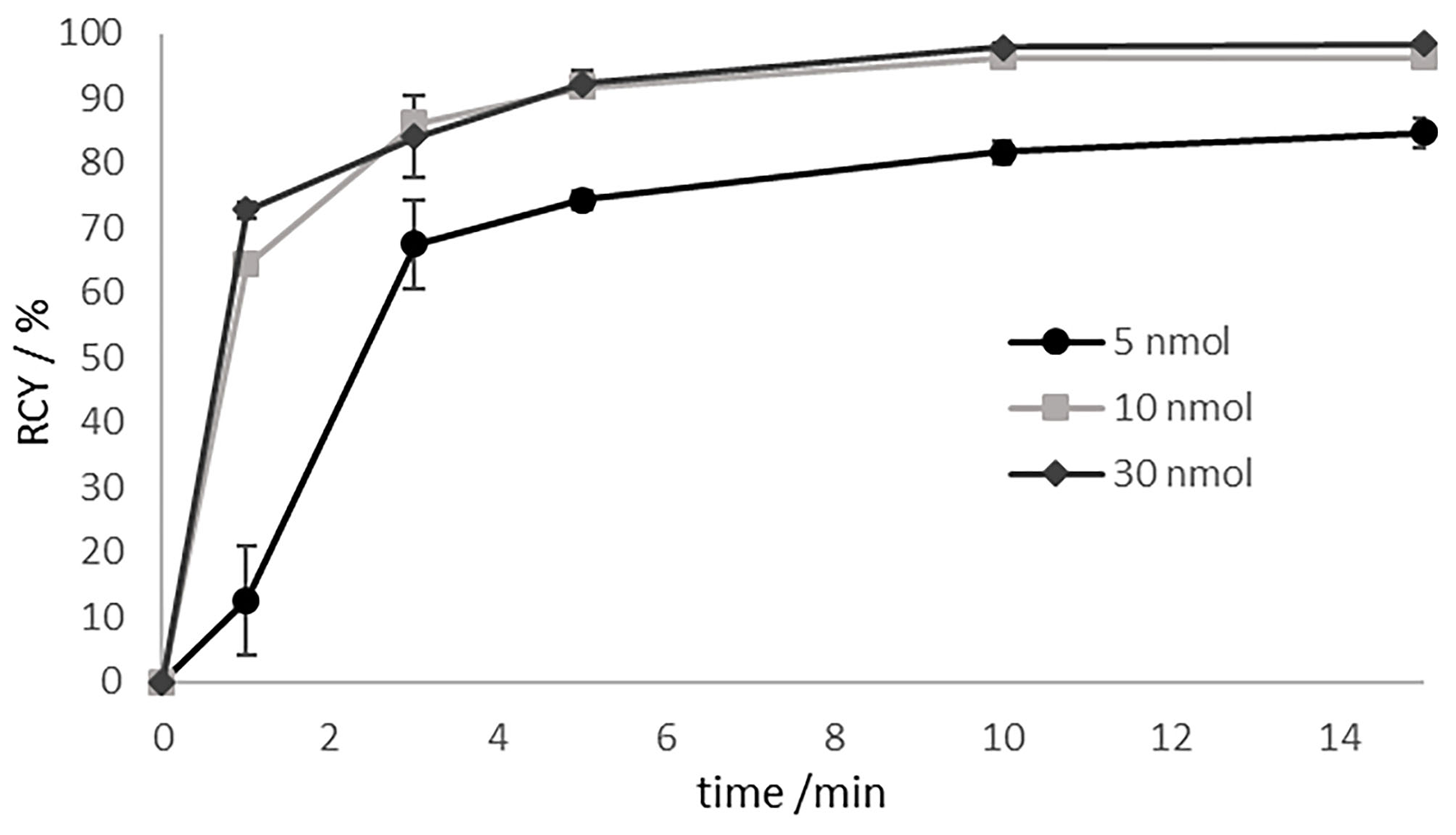 Labeling kinetics of [177Lu]Lu-13 for various amounts of precursor at 95 °C in 1 M ammonium acetate buffer pH 5.5 at 95°C. Precoursor amounts of >10 nmol resulting in RCYs of > 96% after 10 min.