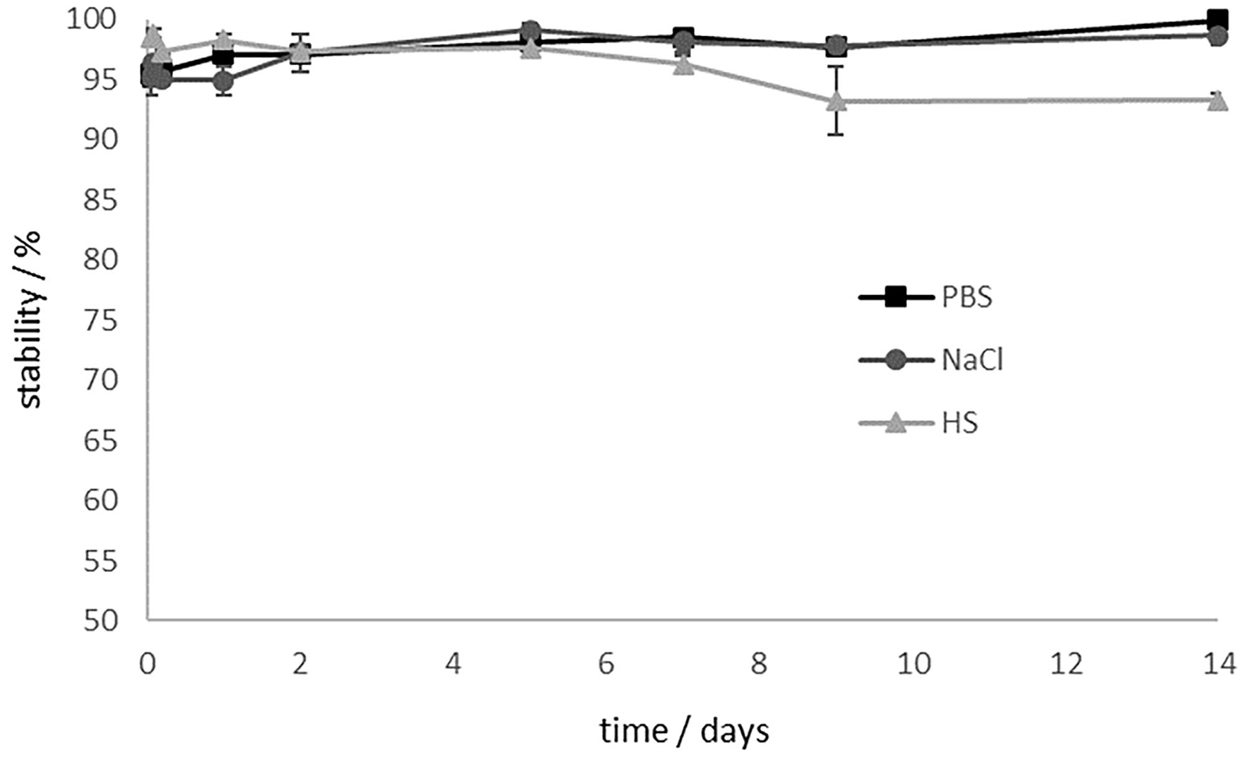 Since the stability of the ligand-chelator conjugate is crucial for a translational use, complex stability studies were carried out in different media (phosphate buffered saline (PBS), isotonic saline (NaCl) and human serum (HS)). Results are shown in Figure 6.