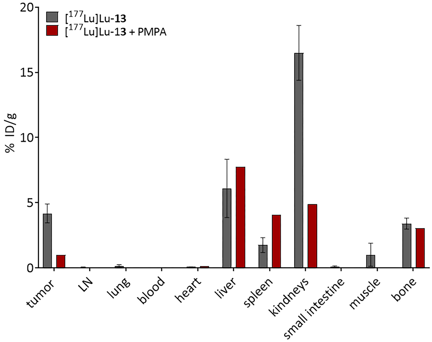 LNCaP xenografts were anesthetized with 2% isoflurane prior to i.v. injection of 0.5 nmol of [177Lu]Lu-13. The specific activity was approximately 3 MBq/nmol. PSMA-selectivity was investigated by co-injection of 1.5 μmol PMPA/mouse.