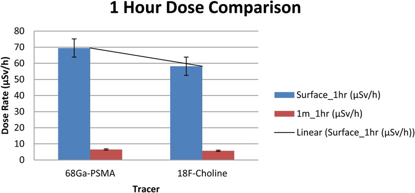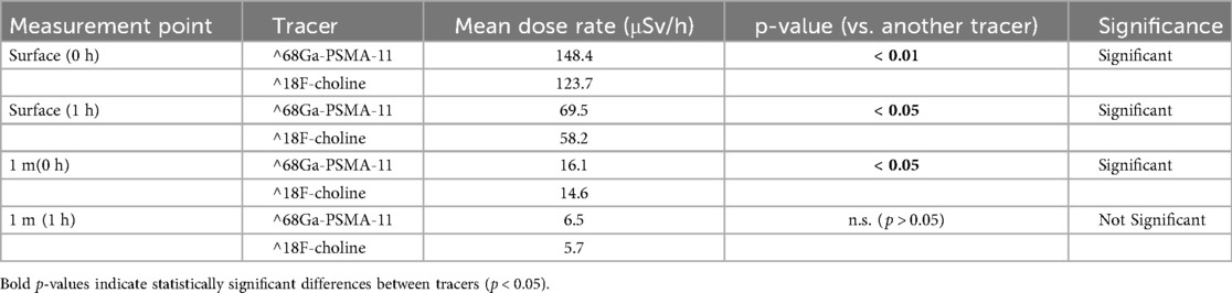 Group comparisons at each geometry and timepoint are reported in Table 4. Immediately post-injection, dose-rates were significantly higher with [^68Ga]Ga-PSMA-11 than with ^18F-choline at both surface (148.4 vs. 123.7 µSv/h; p < 0.01) and 1 m (16.1 vs. 14.6 µSv/h; p < 0.05). At 1 h, surface dose-rates remained significantly different (69.5 vs. 58.2 µSv/h; p < 0.05), whereas the 1 m difference was not significant (6.5 vs. 5.7 µSv/h; p > 0.05) (Table 4). Figure 1 depicts the 1-h distributions at both distances for visual comparison.