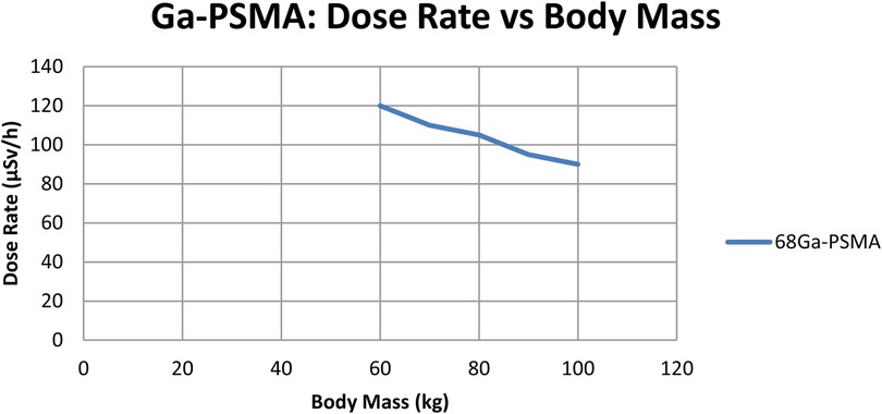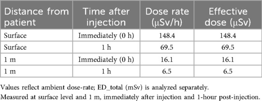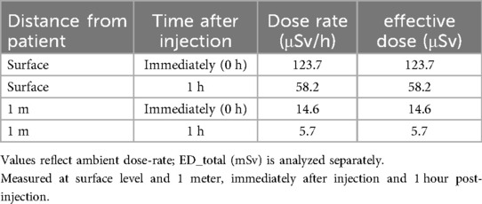 Table 1. Dose-rate (µSv/h) for ^68Ga-PSMA measured at the patient surface and at 1 m, immediately post-injection and at 1 h.