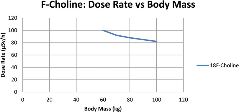 Table 2. Dose-rate (µSv/h) for ^18F-Choline measured at the patient surface and at 1 m, immediately post-injection and at 1 h.