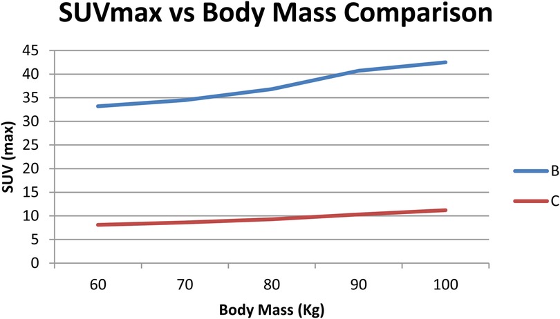 Whole-body PET/CT was performed on a single time-of-flight–capable PET/CT system [(Biograph mCT), (Siemens Healthineers), Erlangen, Germany] using a uniform clinical protocol. Low-dose CT for attenuation correction and anatomical localization used 120 kVp, automatic tube-current modulation (reference 30–50 mAs), pitch ∼1.0–1.2, collimation 64 × 0.6 mm, and rotation time 0.5 s; images were reconstructed with the vendor's standard iterative kernel. No IV contrast was administered. PET emission data were acquired from thorax–abdomen–pelvis with 2.0–3.0 min per bed position (vendor-default bed overlap). PET images were reconstructed with OSEM (3 iterations×21 subsets) with TOF and PSF enabled, matrix 256 × 256, and Gaussian 5–6 mm FWHM post-filter. Standard vendor corrections (attenuation, scatter, randoms, decay, dead-time, normalization) were applied. SUVs were normalized to body weight. Volumes of interest (VOIs) for renal cortex SUVmax were drawn on fused PET/CT while excluding adjacent bowel and hepatic activity; partial-volume considerations followed prior guidance cited in the manuscript (29).