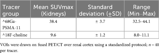 Table 3. Kidney SUVmax by tracer: mean ± SD and range for ^68Ga-PSMA and ^18F-Choline.