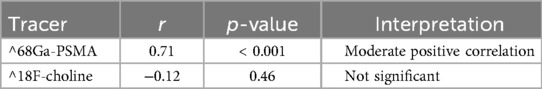 8. Fragkiadaki V, Panagiotidis E, Vlontzou E, Kalathas T, Paschali A, Kypraios C, et al. Correlation of PSA blood levels with standard uptake value maximum (SUVmax) and total metabolic tumor volume (TMTV) in 18F-PSMA-1007 and 18F-choline PET/CT in patients with biochemically recurrent prostate cancer. Nucl Med Commun. (2024) 45(11):924–30. doi: 10.1097/mnm.0000000000001881